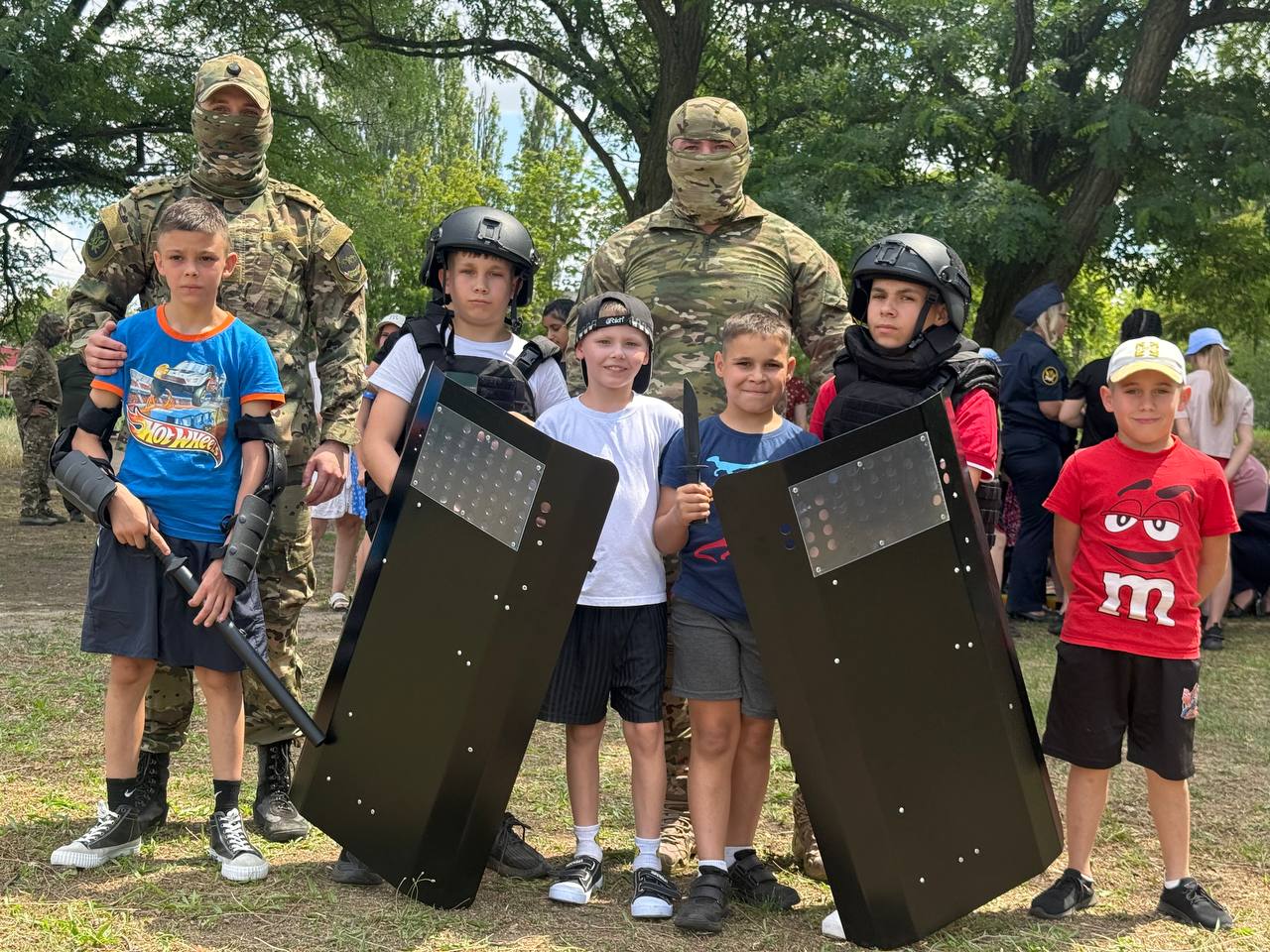 ![]() В гости к детям приехали представители Запорожского областного суда и Совета судей Запорожской области, военные ВС РФ, представители «Единой России», регионального Министерства по молодежной политике, Министерства региональной безопасности Запорожской области, комитета семей воинов Отечества Запорожской области, Общероссийского профессионального союза военнослужащих, Общественной организации «Добровольная народная дружина «Добровольческая молодежная дружина», Регионального отделения Всероссийского общественного экологического Движения «Экосистема», отдела специального назначения "Борус" УФСИН, Мужского монастыря Саввы Освященного, Гендиректор ООО «Мелитопольские сады». Взрослые приехали к детям в пгт Мирное не с пустыми руками. Они привезли сезонные фрукты и ягоды, сладкие подарки и мороженое, игрушки, развивающие игры, одежду и обувь, ранцы к школе, а также бытовую технику. Перед началом мероприятия прозвучал Гимн Российской Федерации и был развернут Государственный флаг. Военные провели с ребятами несколько занятий и мастер-классов по рукопашному бою, тактической медицине, разбору и сборке боевого оружия, а также по управлению беспилотниками. Кроме того, мальчики и девочки смогли примерить на себя снаряжение бойцов спецподразделений – бронежилеты, каски и щиты. Также ребята прошли мастер-класс по изготовлению окопных свечей и брелоков для ключей. И конечно же, накануне Дня семьи, любви и верности состоялся праздничный концерт, в котором выступили ребята из Мелитопольского центра, а также гости – Серафима и Мелания Ивановы, исполнившие песни «Катюша» и «Матушка – земля». |